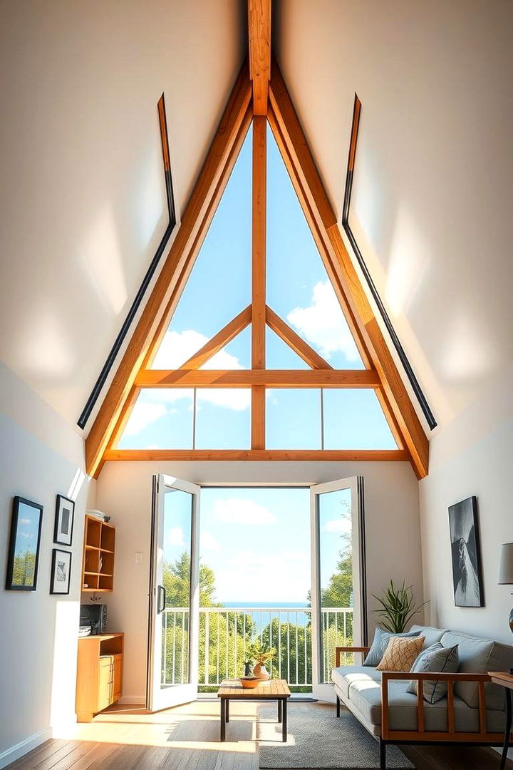 Bringing natural light into every corner, the design emphasizes bright, airy interiors that resonate with energy and optimism. Large windows and an open balcony invite sunlight to flood the living spaces, diminishing the need for artificial lighting. The A-frameβs sloping ceilings not only create unique spatial dynamics but also reflect light beautifully across surfaces. This optimization of natural light enhances the mood and promotes a healthy environment. Homeowners relish the benefits of a naturally lit space that feels both expansive and inviting, encouraging a connection with the outdoors while nurturing a warm, uplifting atmosphere indoors.
