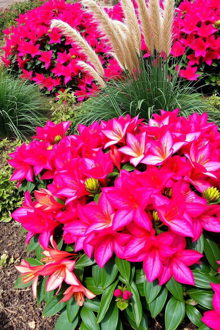 Surprisingly vibrant yet elegantly simple, this idea focuses on creating bold statements with azalea blooms. Large clusters of azaleas in varying shades of pink, red, and white capture the essence of natureโs artistry. The design features intentionally arranged beds to showcase color contrasts, emphasized by complementary perennials and ornamental grasses. This brilliant splash of color not only beautifies your outdoor area but also acts as a focal point that draws guests closer. With well-planned irrigation and careful pruning, the garden remains lively throughout the seasons, celebrating natureโs endless palette with every blossoming period and encouraging a dynamic, artistic landscape.