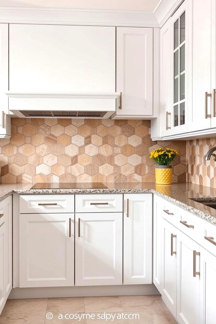 Eco-friendly recycled tiles combine sustainability with innovative design, making them an excellent choice for a modern kitchen backed by white cabinets and granite countertops. These tiles, made from reclaimed materials, bring unique textures and an organic charm that supports environmental practices. The varied tones offer a rustic appeal, emphasizing natural beauty while contributing to green living. Their durability and ease of maintenance make them both practical and stylish. This backsplash idea not only uplifts your kitchen with a story of sustainability but also instills a sense of responsible creativity, merging ecological values with distinctive design appeal.