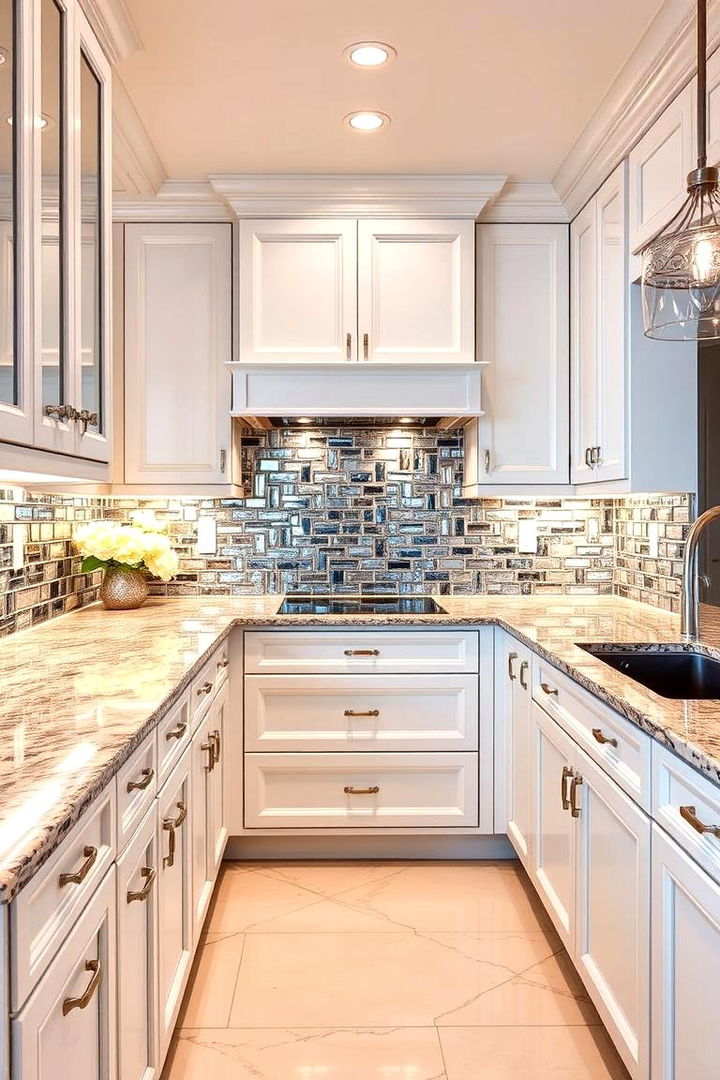 Mirrored backsplash tiles introduce an element of luxury and modern flair into your kitchen. Their reflective surfaces provide an illusion of added space by bouncing light around the room, harmonizing beautifully with white cabinets and granite countertops. This design not only brings a sparkle to your walls but also elevates the overall ambiance, making the space feel larger and more dynamic. The mirrored artistry pairs well with contemporary kitchen decor, enhancing depth and visual appeal. With practical cleaning attributes and a sophisticated finish, this design choice delivers both style and functionality in perfect balance.