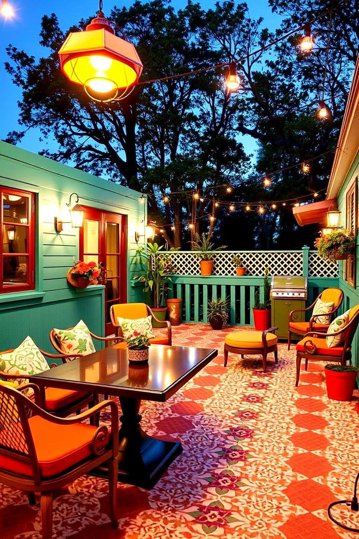 A boho-chic deck space radiates relaxed creativity through an eclectic mix of vibrant patterns, layered textiles, and diverse seating options. This design incorporates colorful rugs, hanging lanterns, and artisan-crafted decor that invite a free-spirited vibe. Natural wood harmonizes with vivid accents, creating an environment that is both laid-back and visually captivating. Ideal for leisurely afternoons with friends or a personal retreat, every detail is arranged to evoke warmth and artistic flair. Enjoy an inviting outdoor haven that encourages self-expression and spontaneity while maintaining functional comfort.