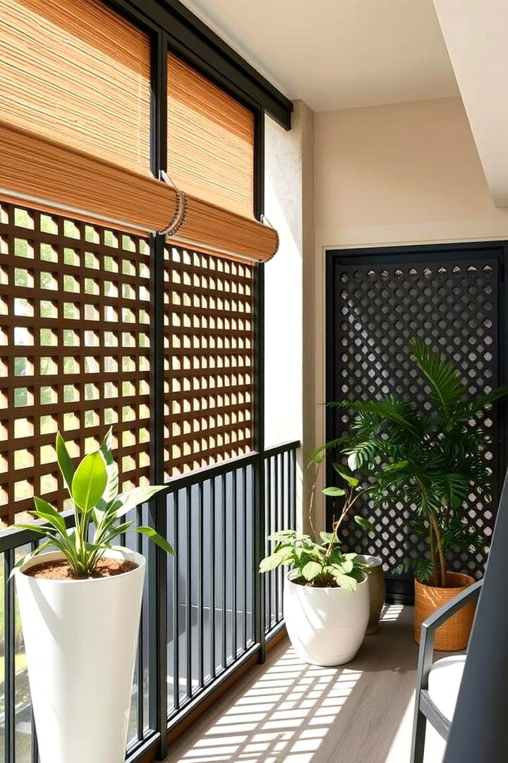 Another versatile solution is adjustable lattice screens that let you customize your level of seclusion with ease. These screens offer a flexible design where slats can be oriented to block or permit varying amounts of natural light and air. The classic pattern of the lattice introduces a timeless elegance while effectively dividing your balcony space. Lightweight and easy to install, they adapt effortlessly to both intimate evenings and lively gatherings. This customizable option marries practicality with style, making it ideal for those seeking an ever-changing balance between openness and privacy in their outdoor environment.