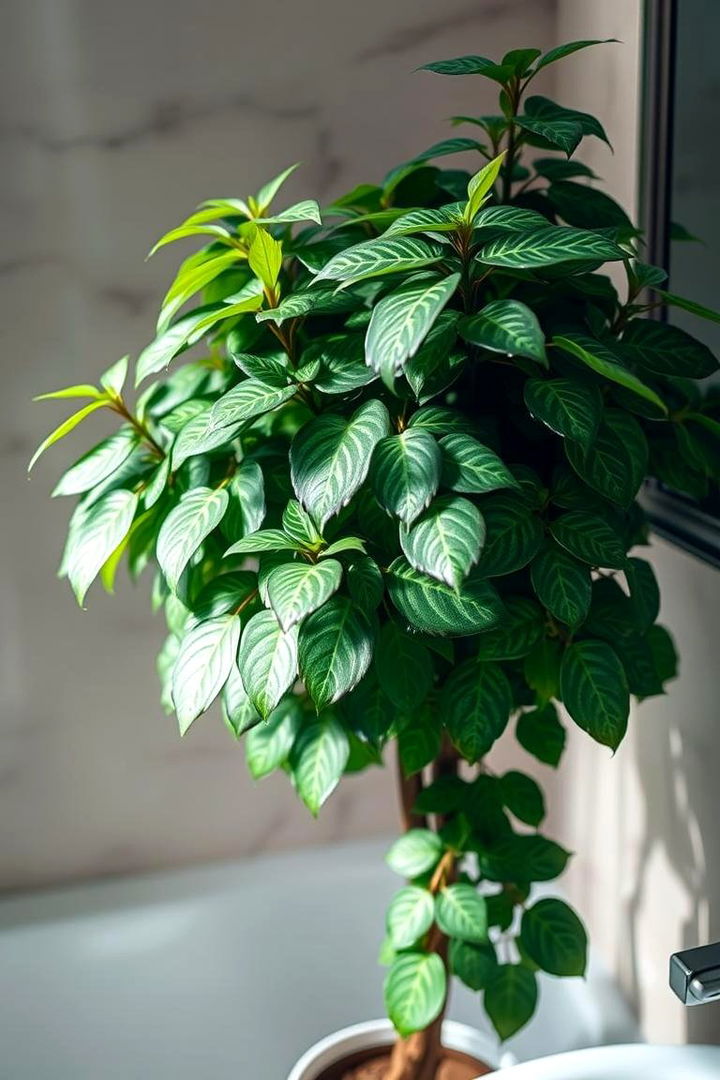 Delicately veined, the Fittonia weaves a tapestry of vibrant color and fine patterns perfect for a refreshing bathroom retreat. Its compact size and striking leaf designs bring life to smaller spaces while thriving in humid, lower light scenarios. The plant’s cheerful foliage creates a dynamic yet subtle focal point that enlivens any corner. Appreciated for its ease of care and decorative potential, the Fittonia offers a gentle pop of color and an artistic flair, enhancing the overall ambiance. Infuse your bathroom with creative energy and modern elegance using this intricately patterned natural gem.