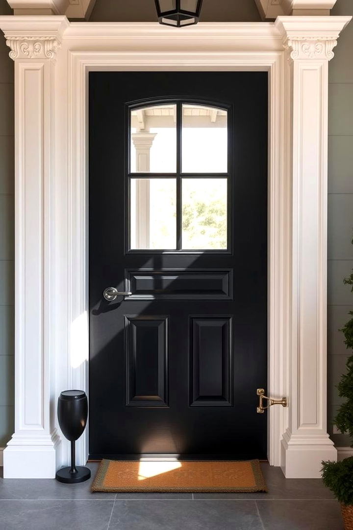 A transitional blend in a black front door design skillfully merges traditional details with contemporary elements to produce a balanced, versatile look. Integrating classic paneling with modern hardware, the door offers a refined appeal that adapts to various architectural styles. The deep black tone accentuates every detail, from sophisticated moldings to sleek finishes, resulting in an entry that is as functional as it is visually striking. Homeowners appreciate the seamless blend of old and new, enjoying an inviting, timeless aesthetic that enhances both curb appeal and overall home style.