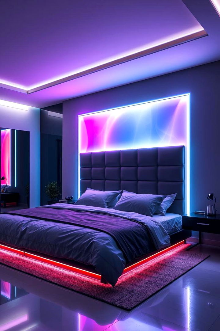At dusk, a black headboard integrated with LED lighting exudes a futuristic allure and customizable ambiance perfect for modern bedrooms. The subtle incorporation of energy-efficient LED strips along the headboard design allows flexible lighting options that evolve with mood and setting. The interplay of shadows and vibrant hues lends a dramatic flair, enhancing focal points and elevating the overall decor. This innovative design merges technology with artistry, offering a blend of functionality and style that caters to both relaxation and vibrant energy. It transforms simple bedroom spaces into dynamic, personalized environments that captivate and inspire.