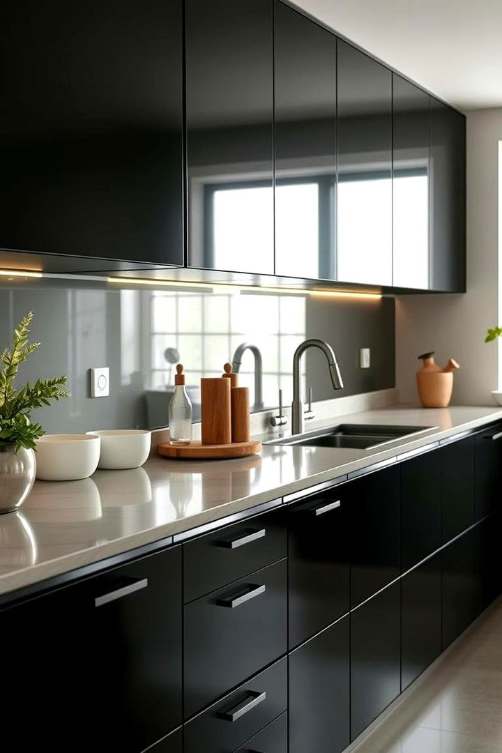 Consider the dramatic impact of high-gloss finishes with black kitchen cabinets. The reflective surfaces amplify light, creating an illusion of spaciousness while injecting an element of luxury into the design. The mirror-like texture of the cabinetry adds depth and sophistication, perfectly complementing modern appliances and metallic fixtures. This polished look elevates the kitchen’s ambiance, making it feel upscale and vibrant. High-gloss cabinetry not only looks stunning but also simplifies cleaning and maintenance, offering a practical yet striking solution for contemporary kitchen design.