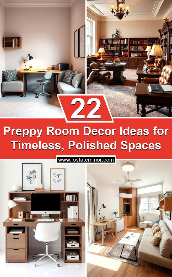 Consider a quiet haven that combines the comfort of a library with preppy elegance. This idea transforms a corner into a timeless reading nook complete with built-in bookshelves, plush seating, and vintage reading lamps. The refined mix of classic wood tones and sophisticated fabrics creates a peaceful retreat perfect for study or leisure reading. Soft yet focused lighting enhances the literary ambiance while decorative accents like antique typewriters and framed prints add layers of historic charm. This design serves as a perfect balance between functionality and style, inviting you to relax and explore your literary passions.