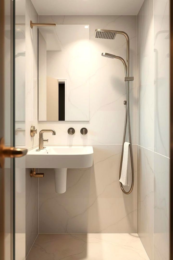 Consider opting for minimal hardware fixtures to keep the wet room’s design clean and uncluttered. By choosing streamlined taps, shower heads, and storage solutions, you eliminate visual distractions and emphasize a crisp contemporary look. Minimal hardware simplifies maintenance and minimizes potential water spots or rust, fostering durability in a moist environment. Each fixture is selected not just for its utility but also for its ability to contribute to a harmonious, modern design that enhances the overall fluidity of the space, making everyday use intuitive and stylish.
